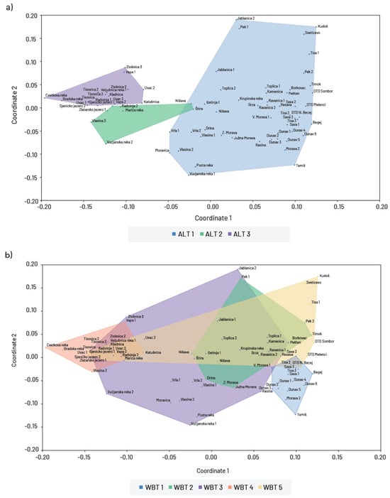 Non-metric multidimensional scaling (NMDS) of chironomid communities from different (a) altitude gradients (ALT 1—study sites up to 500 m a.s.l.; ALT 2—study sites from 500 to 1000 m a.s.l.; ALT 3—study sites above 1000 m a.s.l.) and (b) waterbody types (WBT 1—large rivers with fine substrate (silt, clay mud, and sand); WBT 2—mix of large and medium rivers with coarse substrate (gravel, stones, and rocks); WBT 3—small watercourses with coarse substrate; WBT 4—small mountainous rivers and streams and WBT 5—slow flowing/stagnant waters (artificial canals and reservoirs)) based on the Bray–Curtis similarity matrix.