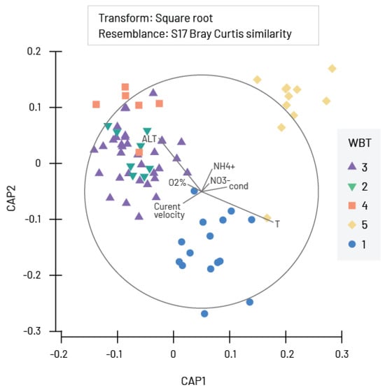 Canonical analysis of principal coordinates (CAP) of chironomid samples collected throughout Serbia and correlations with environmental parameters WBT 1—large rivers with fine substrate (silt, clay mud, and sand); WBT 2—mix of large and medium rivers with coarse substrate (gravel, stones, and rocks); WBT 3—small watercourses with coarse substrate; WBT 4—small mountainous rivers and streams and WBT 5—slow flowing/stagnant waters (artificial canals and reservoirs; cond—electrical conductivity; O2%—oxygen saturation; NO3−—nitrates; NH4+—ammonium ions; ALT—altitude.