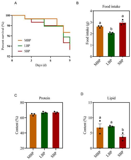 (A) Honeybee survival rate. (B) The intake of pollen during feeding. (C) Protein deposition in the honeybee body. (D) Lipid deposition in honeybee bodies. The date is shown as the mean ± SEM of three independent experiments (n = 3). Various letters above the bars indicate significant differences between two groups (p < 0.05) as determined by one-way ANOVA followed by Tukey’s multiple comparison test.