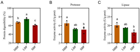 We measured protein digestibility and the activities of intestinal digestive enzymes, including protease and lipase (Figure 2). LBP had the highest protein digestibility, whereas SBP showed the lowest digestibility (Figure 2A). Protease (Figure 2B) and lipase (Figure 2C) activities were significantly higher in bees fed MBP and LBP than in those fed SBP. However, no notable differences in enzyme activities were observed between the MBP and LBP groups.
