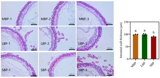 Paraffin sections of the midgut were prepared, stained using hematoxylin and eosin, and examined under a light microscope. The thickness of the intestinal wall was measured. The midgut of honeybees fed SBP exhibited significantly thinner intestinal walls than those of honeybees fed CBP and LBP (Figure 3). This suggests that SBP may provide less support for gut structural development.