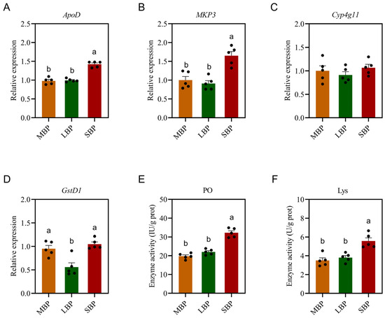 The impact of pollen diets on honeybee immunity was assessed by measuring the activities of immune enzymes and the expression of specific immune-related genes (Figure 4). Gene-expression analysis showed no significant difference in the expression of ApoD and MKP3 in honeybees fed LBP compared to those fed MBP; however, both were lower than those fed SBP (Figure 4A,B). There was no significant difference in the expression of Cyp4g11 among the three groups (Figure 4C). There was no significant difference in the expression of GstD1 in honeybees fed SBP compared to those fed MBP, but both were significantly higher than those fed LBP (Figure 4D). Regarding enzyme activity, PO activity (Figure 4E) and Lys activity (Figure 4F) were significantly higher in honeybees fed SBP than in those fed LBP and MBP. These results suggest that SBP may enhance certain aspects of honeybee immunity, potentially as a response to dietary differences.
