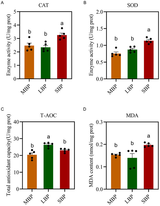 We measured the activities of antioxidant enzymes and overall antioxidant capacity following the ingestion of three types of bee pollen (Figure 5). The results revealed no significant differences in catalase (CAT) and superoxide dismutase (SOD) activities between honeybees fed LBP and MBP. However, honeybees fed SBP exhibited an increase in the activities of both enzymes (Figure 5A,B). Furthermore, the total antioxidant capacity of honeybees fed LBP and SBP was significantly higher (Figure 5C). By contrast, to evaluate the oxidative damage, we measured the malondialdehyde (MDA) content in the bodies of the honeybees, which was significantly higher in honeybees fed SBP than in those fed MBP and LBP (Figure 5D).