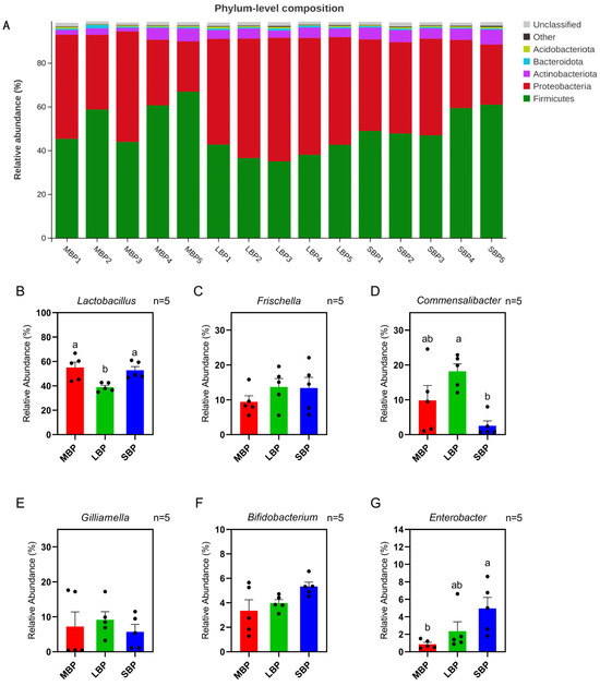 Comparison of major phyla and genera. (A) Relative abundances of the five most abundant bacterial phyla in all samples. (B–G) Comparison of the relative abundances of the genera. (B) Lactobacillus. (C) Frischella. (D) Commensalibacter. (E) Gilliamella. (F) Bifidobacterium. (G) Enterobacter. Data are presented as mean ± SEM (n = 5) of three independent experiments. Different letters above the bars indicate significant differences between two groups (p < 0.05), as determined by one-way ANOVA with Tukey’s multiple comparison test.