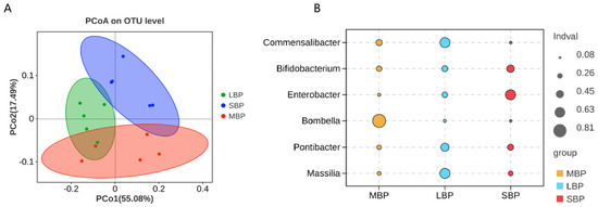 We conducted an alpha diversity analysis using the Tukey HSD test (Supplementary Table S6). No significant differences in bacterial species richness were noted among bees consuming the three different pollens, as shown by the alpha diversity index (Supplementary Table S7). Regarding microbial community similarity at the genus level, principal coordinate analysis (PCoA) based on Weighted–Unifrac distances revealed that different pollen diets altered the microbial community composition in bee guts (Figure 7A; Supplementary Table S8). Indicator species analyses at the genus level highlighted distinct microbial signatures for each pollen type. Honeybees fed on MBP exhibited a high abundance of Bombella. In those fed on LBP, Commensalibacter and Massilia were predominant, whereas bees consuming SBP showed increased abundances of Bifidobacterium and Enterobacter (Figure 7B; Supplementary Table S9).