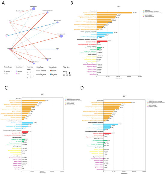 We conducted a PICRUSt2−based predictive functional analysis. Sequencing data were categorized into six broad biological metabolic pathways: metabolism, genetic information processing, environmental information processing, cellular processes, human diseases, and organismal systems (Figure 8B–D; Supplementary Table S11). Among these, metabolism emerged as the dominant function. Further analysis of secondary functional levels of genes revealed 33 subfunctions, including carbohydrate metabolism, amino acid metabolism, lipid metabolism, and energy metabolism. Except for low-abundance functional genes related to signaling molecules and interactions, transport and catabolism, and other minor pathways, significant differences were observed in all other subfunctions between the groups (Supplementary Table S12).