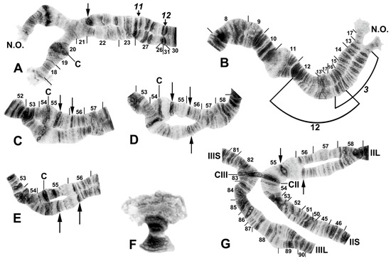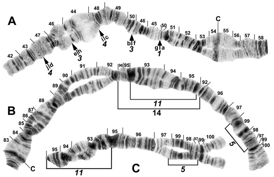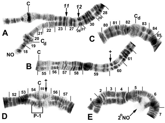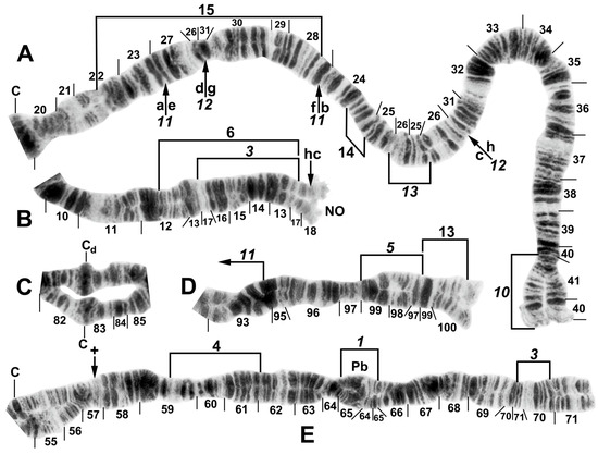 - Bedo, D.G. C banding in polytene chromosomes of Simulium ornatipes and S. melatum (Diptera: Simuliidae). Chromosoma 1975, 51, 291–300. [Google Scholar] [CrossRef]