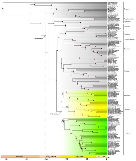 Phylogenetic results by mitochondrial genome dataset (main tree). (a): Stauropini, highlighted by aqua; (b): Notodontini, highlighted by green; (c): Fentoniini, highlighted by yellow. Circle-shaped nodes’ supporting value > 90; time scale showed as horizontal axis; asterisks indicate fossil calibration points.