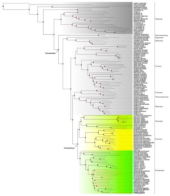 Forbes (1939, 1948) first formally identified tribal divisions within Notodontinae, defining Notodontini to include six genera: Notodonta, Ellida, Nadata, Peridea, Pheosia, and Odontosia [8,9]. Miller (1991) later reassigned Peridea, Nadata, and Ellida to Phaleriniae, whereas Notodonta, Pheosia, and Odontosia remained within Notodontini [1]. Kobayashi and Nonaka’s molecular study (2016) supported Miller’s placement (of Notodonta, Nadata, Peridea, Pheosia, and Odontosia within Notodontini), but transferred Ellida to Periergosinae [3]. Traditionally, Ptilodotinae (=Ptilophorinae Matsumura, 1929) was related to Notodontinae in terms of classification, but it performed as a paraphyletic group in molecular studies, with Ptilodon, Hagapteryx, Togopteryx, Himeropteryx, Semidonta, Allodontoides, and Epodonta transferred from Ptilodotinae to Notodontinae [3,5]. In contrast to the latest phylogenetic study, Stauroplitis, Zaranga, Omichlis, and Formofentonia, which previously belonged to Stauropini, were reassigned to Notodontini.
