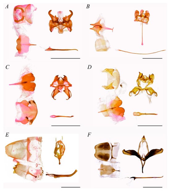 Figure 3. Male genitalia of Stauropini (scale bar = 5 mm). (A) Stauropus major, (B) Stauropus basalis, (C) Stauropus sikkimensis, (D) Stauropus sikkimensis, (E) Netria viridescens, (F) Syntypistis sinope.
