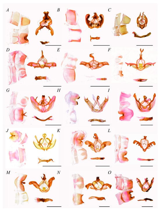 Figure 4. Male genitalia of Notodontini (scale bar = 5 mm). (A) Stauroplitis accomodus, (B) Zaranga tukuringra, (C) Formofentonia orbifer, (D) Himeropteryx mirabilior, (E) Ptilodon ladislai, (F) Allodontoides tenebrosa, (G) Epodonta lineata, (H) Homocentridia picta, (I) Euhampsonia cristata, (J) Togepteryx dorsoalbida, (K) Lophocosma intermedia, (L) Metriaeschra zhubajie, (M) Pheosiopsis gilda, (N) Acmeshachia gigantea, (O) Peridea sikkima.