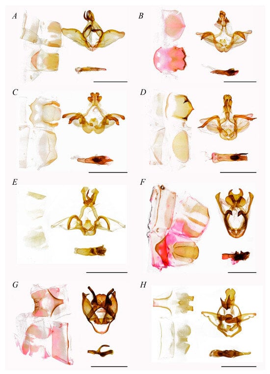 Figure 5. Male genitalia of Fentoniini (scale bar = 5 mm). (A) Parachadisra atrifusa, (B) Neodrymonia taipoenis, (C) Neodrymonia nicoruscens, (D) Neodrymonia albinomarginata, (E) Pseudofentonia plagiviridis, (F) Mesophalera amica, (G) Disparia dua, (H) Libido sp.