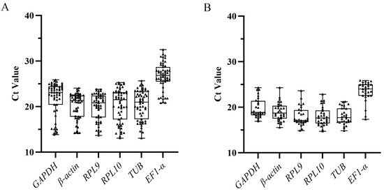 Expression levels of six candidate reference genes in the S. trifolii. (A) Development stage (n = 55). (B) Adult tissue (n = 30). The black-centered triangles represent the Ct values for each sample. The line across the box shows the median value. The top and bottom whiskers represent the 25th and 75th percentiles, respectively, and the bars represent the minimum and maximum.