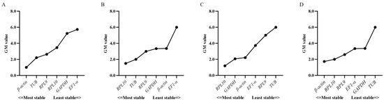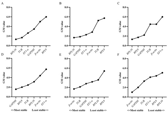 The primers for RT-qPCR were designed for six reference genes with amplification lengths of 79 bp (GAPDH) to 161 bp (RPL9) (Table 2). The results showed that the melting curves of the six reference genes were all single peaks (Figure S1), indicating the high specificity of the RT-qPCR primers. The amplification efficiencies of the primers ranged from 90.951% (TUB) to 108.777% (RPL9), and the regression coefficients (R2) ranged from 0.990 (β-actin, GAPDH, and RPL9) to 0.999 (TUB) (Table 2), indicating that the designed primers met the requirements of RT-qPCR experiments.