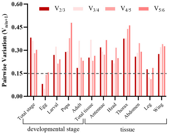 Optimal reference gene selection for RT-qPCR normalization in S. trifolii at different developmental stages and different tissue conditions. The threshold for pairwise variation (Vn/n + 1) is 0.15.