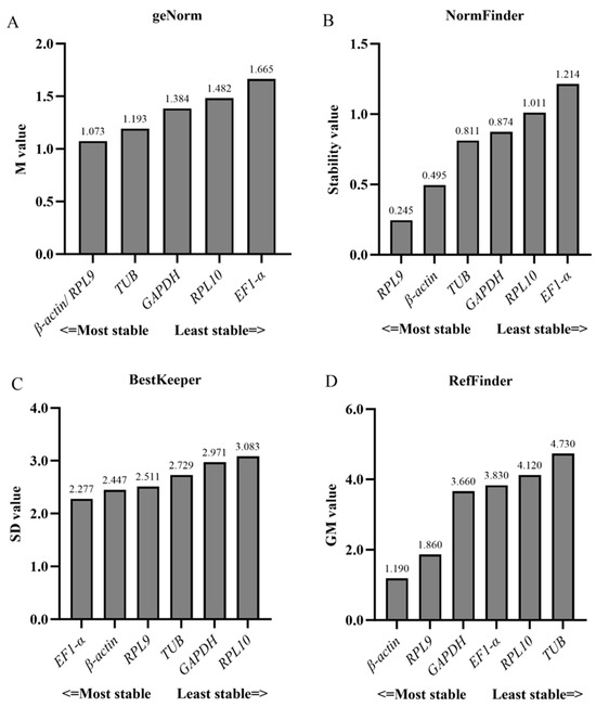 Based on RefFinder (Figure 2) and geNorm (Figure 3) analyses, the most stable reference genes in the egg stage were β-actin and TUB; RPL10, TUB, and RPL9 were the most stable in the larval stage; RPL10, GAPDH, and β-actin were the most stable in the pupal stage; and β-actin, RPL10, and RPL9 were the most stable in the adult stage. In all developmental stages, combined geNorm and NormFinder algorithms identified β-actin and RPL9 as the two most stable reference genes. BestKeeper analysis independently validated β-actin and EF1-α as the most reliable normalizers. A comprehensive stability ranking generated by RefFinder demonstrated the following descending order: β-actin > RPL9 > GAPDH > EF1-α > RPL10 > TUB (Figure 4). geNorm analysis indicated a pairwise variation value of V2/3 = 0.381 (greater than the 0.15 threshold), supporting the use of three reference genes for accurate normalization. Based on this criterion and stability rankings, the optimal combination for developmental stage normalization was determined to be β-actin, RPL9, and GAPDH (Figure 3).