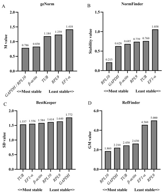 Expression stability of candidate reference genes was evaluated using four computational algorithms: geNorm v3.5 [13], NormFinder v0.953 [31], BestKeeper [32], and RefFinder [33] (https://www.ciidirsinaloa.com.mx/RefFinder-master/, accessed 21 February 2025). Stability metrics were calculated as follows: geNorm: M-values (lower values indicate higher stability); NormFinder: Stability values (SV; lower SV indicates better stability); BestKeeper: Standard deviation (SD; lower SD reflects higher stability); and RefFinder: Geometric mean (GM) of normalized ranks derived from the four algorithms. Optimal reference gene number was determined by geNorm pairwise variation analysis (Vn/Vn + 1). A threshold of 0.15 was applied: if Vn/Vn + 1 ≤ 0.15, n reference genes were deemed sufficient; otherwise, n + 1 genes were recommended for RT-qPCR normalization.