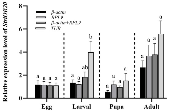 Expression level of StriOR20 at different developmental stages of S. trifolii. Error bar, means ± standard error (SE) (n = 5). Different lowercase letters above bars in the same treatment represent significant differences (p < 0.05, one-way ANOVA analysis followed by Tukey’s test).