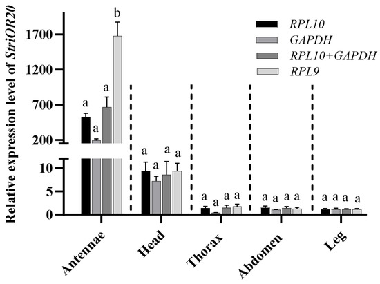 Expression level of StriOR20 in different tissues of Scotogramma trifolii. Error bar, means ± SE (n = 5). Different lowercase letters above bars in the same treatment represent significant differences (p < 0.05, one-way ANOVA analysis followed by Tukey’s test).