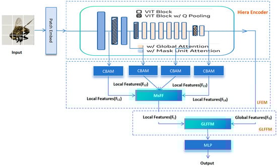 The newly added fly image dataset prepared in the previous step was placed on a framework called GLB-ViT for the fine-grained image classification task of flies, efficiently integrating the global and local information at different levels in the image, which was developed by our group earlier. The GLB-ViT architecture addresses the need for the hierarchical recognition of morphological features of Diptera insects. The baseline network of GLB-ViT is the Hiera-Small-224 model (Hierarchical Efficient Representation Architecture) []. As shown in Figure 1 it consists of three key components: the Hiera Encoder block for global feature extraction; the Local Feature Extraction Module (LFEM) for local information mining, where the CBAM module enhances the extraction of local features by adaptively emphasising important channels and spatial regions; and the Global and Local Feature Fusion Module (GLFFM) to integrate both types of features. After fusion, an MLP outputs classification results []. This framework’s effective combination of global and local features offers a robust solution for forensic fly identification.