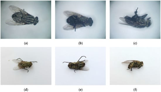 In this study, the selected fly species with darker body colours were photographed by placing them on a white background. It fit the operational conditions of forensic science practice and effectively avoided the interference of complex backgrounds on the images, while enhancing the image contrast in the training and inference stages []. However, the insect samples of some species used in this study were all dead when the pictures were collected, and the colour of the insect corpses had changed to a certain extent, and the limbs and trunks were twisted or even absent. The change in and absence of appearance may be an important factor affecting the recognition rate [], which makes identification more difficult. Follow-up studies need to consider how to overcome these sample deficiencies, such as exploring more scientific methods of preserving and photographing samples, or adopting more advanced image-processing techniques to repair and enhance the images of damaged samples, or developing image recognition AI models targeted at this type of sample.