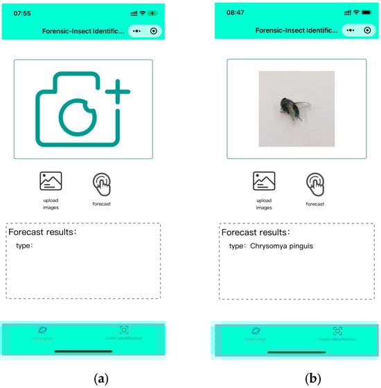 Based on the trained model, we successfully developed a Mini Program for fly species identification based on image recognition, named Forensic-Insect Identification 1.0 (FII 1.0), which supports both iOS and Android systems. The user interface of FII 1.0 is designed to be simple and intuitive, which is easy for users to operate. The main functions of FII 1.0 include real-time photo identification, local image uploading and identification result display. As shown in Figure 3, WMP calls the device camera or photo album to obtain the fly image, and transmits the image to the back-end server for real-time recognition, and the recognition result will be returned to the user through the WMP interface to display the species name of the fly.