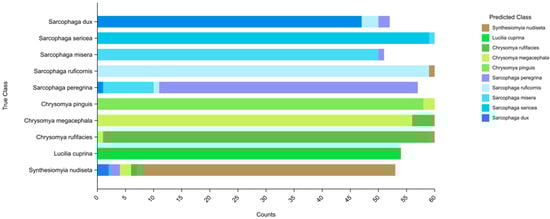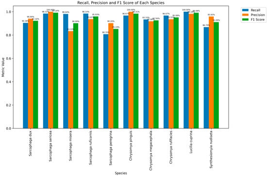 Precision, recall, and F1 scores for each fly species varied but were all greater than 80.00%, indicating a good overall performance. The F1 score combines recall and precision. Species such as S. sericea (99.16%), L. cuprina (99.08%), and C. pinguis (98.31%) achieved high F1 scores, suggesting a balance between the two metrics and excellent recognition performance. In contrast, S. peregrina (85.19%) had a relatively low F1 score. This species needs improvement in both recall and precision (Figure 6).