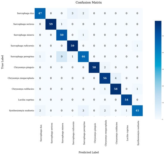 The database of this model, updated by this study, was able to achieve preliminary discrimination of 10 sarcosaphagous fly species in four genera. In contrast, some other studies achieved high accuracy in genus-level classification but lacked in-depth classification within the same genus [,]. There were also studies covering multiple families and fly variants, yet they did not deal with the identification of different species within the same genus []. This suggests that this study is pioneering in the exploration of species-level classification, adding the ability to classify flies more accurately based on AI methods. Unlike two-dimensional objects, the fly carapace is a three-dimensional structure, and the feature points for morphological classification may be distributed in multiple planes. Currently, there are studies to distinguish necrophilous flies by decision tree methods, random forest algorithms combined with wing morphometric data [,,], or identification of species by CNNs image learning of posterior stomata [], which achieved certain better results, providing a path for its continuation in feature mining and model optimisation after this study, and thus expected to further improve the recognition accuracy.