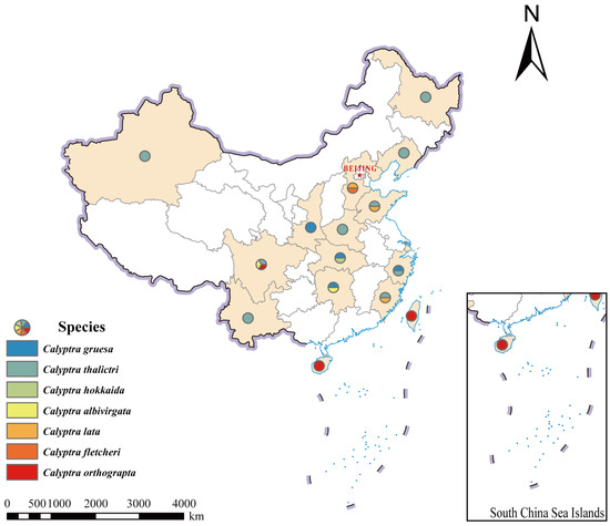 The distributional data of Calyptra were extracted from voucher specimens and compiled into a CSV file containing species names and geographic coordinates. The data on provincial administrative boundaries and national borders of China were obtained from the website of the National Geomatics Center of China [19]. The distribution of Calyptra species in China was generated using ArcGIS Desktop v10.8 (Esri Inc., Redlands, CA, USA) [20] based on the processed distribution point data.