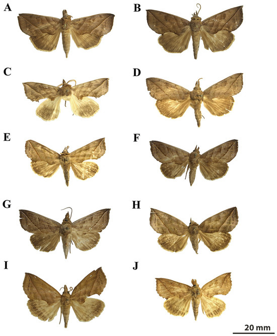 Adults of Calyptra spp.: (A) C. gruesa ♀; (B) C. gruesa ♂; (C) C. thalictri ♂; (D) C. albivirgata ♂; (E) C. hokkaida ♂; (F) C. orthograpta ♂; (G) C. orthograpta ♀; (H) C. fletcheri ♀; (I) C. lata ♂; (J) C. lata ♀.