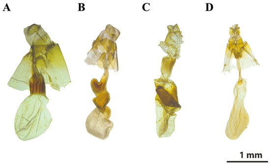 Species identification was conducted based on external morphological characters and genitalia structures and by following identification keys in previous studies [1,14,16]. Specimens were mainly sourced from the Entomological Museum at Northwest A&F University, Yangling, China. Standard protocols were applied for genitalia extraction and slide preparation [17,18]. Male and female genitalia were immersed in a 10% KOH solution overnight to eliminate soft tissue, subsequently rinsed with distilled water, and examined under a stereo microscope. Dissected genitalia were dehydrated using 50%, 75%, 85%, 95%, and 100% ethanol. This dehydration process was required to remove moisture, which aids in the prevention of tissue distortion, clarity of morphological structures, and long-term storage. To avoid damage or loss of genitalia, all dissected parts were carefully put on microscope slides with Canada balsam as the mounting medium and covered with cover slips. Each slide was labeled with a slide number, gender, and species identification, and the slides were maintained in slide boxes.
