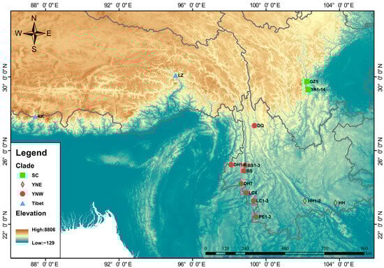 The Yunnan and Sichuan populations did not exhibit mutual monophyly, which may reflect a recent divergence history. However, these differences in phylogenetic structure likely arose due to discrepancies in evolutionary rates between nuclear and mitochondrial genomes. Mitochondrial genes complete genealogical sorting at a faster rate [54,55].
