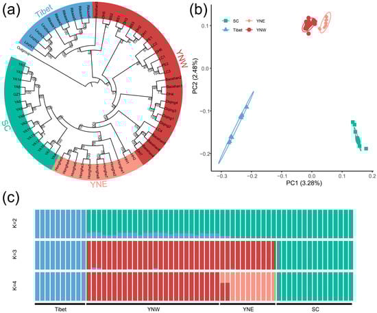 Population genetic structure based on SNPs of the Himalayan giant honeybee. (a) Maximum likelihood (ML) phylogenetic tree constructed by IQ-TREE revealing four clusters of Himalayan giant honeybee from different geographical populations: “Tibet”, “YNW” (Western Yunnan), “YNE” (Eastern Yunnan), and “SC” (Sichuan) (ML bootstrap values are indicated at the nodes). (b) PCA plot revealing the four distinct genetic clusters. (c) A mixture of results with K values ranging from 2 to 4, regarding four ancestral populations (K = 4). Different colors of individuals data points correspond to their cluster identities.