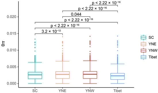 Pairwise FST values among the four populations ranged from 0.031 to 0.211, with an average of 0.111. According to FST values and the criteria for differentiation levels, the FST values between Tibet and SC (FST = 0.211), as well as between Tibet and YNE (FST = 0.160), fell within the range of 0.15 < FST < 0.25, indicating high differentiation. The FST values between Tibet and YNW (FST = 0.115), between YNE and SC (FST = 0.074), and between YNW and SC (FST = 0.075) were in the interval of 0.05 < FST < 0.15, reflecting moderate differentiation. By contrast, the FST value between YNE and YNW (FST = 0.031) fell within 0 < FST < 0.05, exhibiting low differentiation. The relatively low FST between the Sichuan population and the two Yunnan populations suggests a relationship among these groups. However, the relatively high FST values between the Tibetan population and the other populations suggest that the Tibetan population has significant genetic differentiation. Significant differences in nucleotide diversity were observed among the different populations. Furthermore, the average θπ values of the Tibet, western Yunnan, eastern Yunnan, and Sichuan populations were 0.00222, 0.00265, 0.00261, and 0.00247, respectively (Figure 3), with the lowest value occurring in Tibet and the highest in western Yunnan.