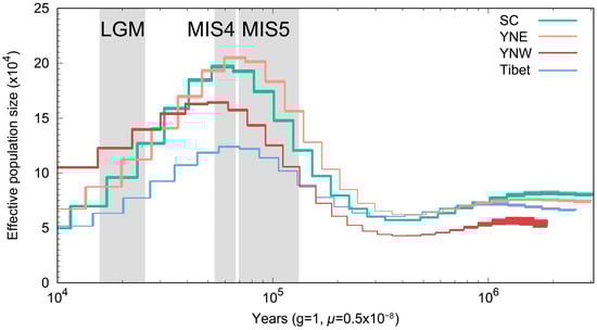 Changes in effective population size were correlated with historical global climate fluctuations, and during the last major interglacial stage (MIS5; ~70,000–130,000 years ago) [46,47,48] the effective population size increased and reached a maximum. Following MIS5, the effective population size stabilized and began to gradually decline during MIS4. This suggests that past climate change has severely impacted the effective population size of A. laboriosa. The observed increase in effective population size during warmer periods suggests that higher global temperatures may have been favorable for A. laboriosa populations. Furthermore, the patterns of effective population size changing from the MIS5 phase to MIS4 were similar to those observed in A. cerana [49]. After the MIS5 phase, prolonged low temperatures led to a decline in the effective population sizes of all four populations until the end of the Last Glacial Maximum (LGM; ~18,000–27,000 years ago) [50]. Subsequently, the effective population sizes of all four populations either stabilized or recovered, but ultimately declined again until more recent times.