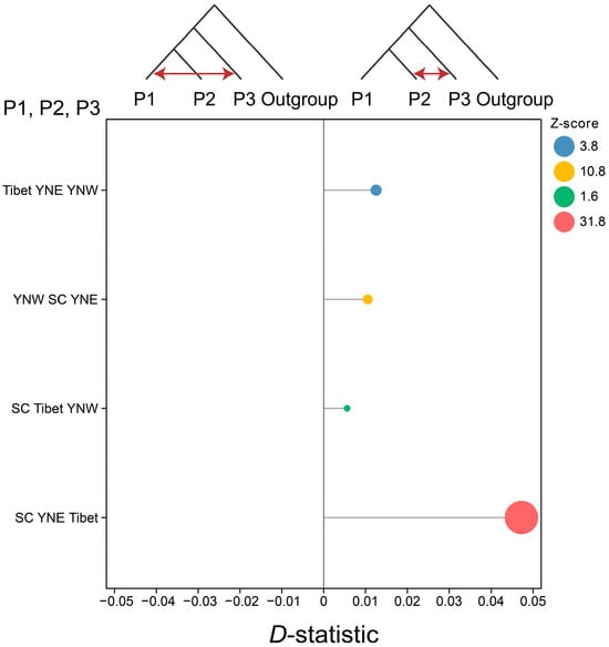 For the D-statistic analysis, the horizontal axis represents the D-statistic, ranging from −0.05 to 0.05; all calculated D-statistics were greater than 0, indicating the presence of gene flow from P3 to P2. The Z-scores for SC YNE Tibet, YNW SC YNE, and Tibet YNE YNW were 31.8, 10.8, and 3.8, respectively, with all exceeding the threshold of 3, indicating significant gene flow (Figure 5). Thus, the results demonstrated gene flow from the Tibetan population to the eastern Yunnan population, from the western Yunnan population to the eastern Yunnan population, and from the eastern Yunnan population to the Sichuan population. Additionally, gene flow from the Tibetan population to the eastern Yunnan population was further supported by TreeMix analysis (Figure S2).