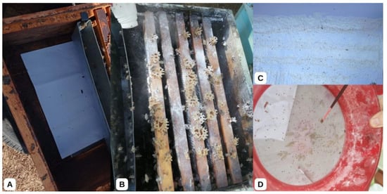 Collection of live varroa samples from the beehives. (A) Laying A3 paper under the frames; (B) applying powdered sugar between the frames on the honeybees; (C) collecting varroa falling on the paper; (D) sieving the powdered sugar with a sieve to clean the varroa.