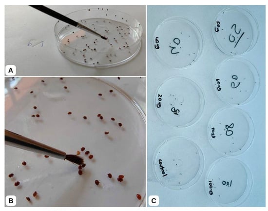 The LD50 analyses of varroa mite samples were performed in petri dishes. (A) The varroa mites cleaned before were removed with a paintbrush into a clean petri dish; (B) varroa mites were kept for 2 h and then checked for viability with a paintbrush touch; (C) active varroa mites were transferred to petri dishes loaded beforehand with different concentrations of flumethrin for LD50 tests.