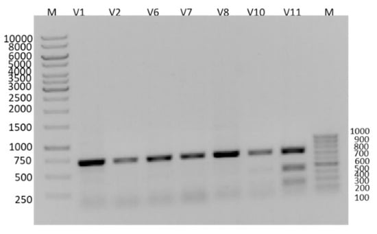 Sanger sequencing chromatograms from 12 locations (V1, V2, V4–V10, V20, V22) were analyzed using the BioEdit software version 7.2.5 (see Mitton et al., 2021) []. Sequence results were analyzed using Bioedit, MEGA X, and BlastN to identify mutations (alleles) []. DNA isolation and PCR were performed on five mites per location. Genotypes were determined by integrating PCR-RFLP band intensities, as described by Stara et al., 2019 [], and sequence chromatogram profiles (as reported by Mitton et al., 2021) []. The resulting genotypes of 110 Varroa mites are summarized in Table 3.