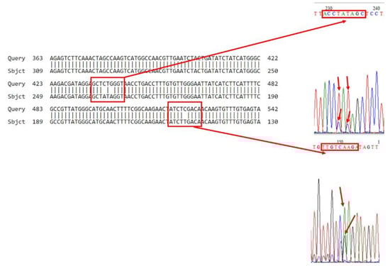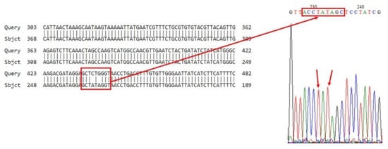 Sequence analysis of the V8 sample revealed the Leu (CTG) → Ile (ATA) mutation (Figure 5). When the genotype was interpreted according to the RLFP and sequence results, in general, 70% of the alleles were resistant alleles (Ile/Ile), and 30% were GTG (Val) alleles (Table 3). Sequence analysis of the V9 sample clearly showed the Leu (CTG) → Ile (ATA) mutation (Figure S6). When the genotype was interpreted according to the RLFP and sequence results, in general, 70% of the alleles were resistant alleles (Ile/Ile), and 30% were ATG (Met) alleles (Table 3).