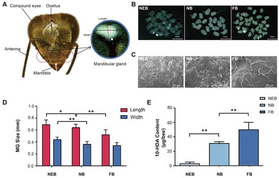 Morphology and secretion were different between the MGs of newly emerged bees (NEBs), nurse bees (NBs), and forager bees (FBs) of A. mellifera. (A) Head structure of worker bee. (B) Light microscopy images of MGs in NEBs, NBs, and FBs (scale bar = 1 mm). (C) Scanning electron microscopy (SEM) images showing the surface morphology of MGs in NEBs, NBs, and FBs. (scale bar = 50 μm). (D) MG size comparison among NEBs, NBs, and FBs. (E) 10-HDA content based on HPLC in the MGs of NEBs, NBs, and FBs, error bars represent data from bees across three colonies with three biological replicates. Statistical significance was determined by the two-tailed unpaired Student’s t-test. ** and * indicate statistical significance at p < 0.01 and p < 0.05, respectively.