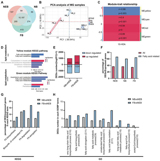 Functional annotation of differentially expressed genes (DEGs) in the MGs of NEBs, NBs, and FBs in Apis mellifera. (A) Distribution of expressed genes in the MGs of NEBs, NBs, and FBs (genes with read counts ≥ 3 in at least two out of three samples are considered expressed). (B) PCA analysis of the MG of the NEB, NB, and FB samples. (C) Correlation between the four gene modules and 10-HDA content (r indicates the correlation coefficient, p indicates the result of the Pearson’s correlation test) based on WGCNA analysis. (D) KEGG enrichment of the genes from yellow and green modules. (E) Number of up- and downregulated DEGs in various comparisons (NBs vs. NEBs, FBs vs. NEBs). (F) Proportion of DEGs involved in fatty acid metabolism in the MGs of NEBs, NBs, and FBs. (G) Proportion of DEGs associated with fatty acid metabolism in each KEGG term. (H) Proportion of DEGs associated with fatty acid metabolism in each GO term.