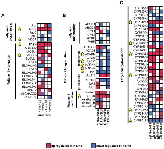 Expression of DEGs related to 10-HDA metabolism in the MGs of A. mellifera and A. cerana. (A–C) Expression levels of DEGs in 6 modules related to 10-HDA metabolism between NBs/FBs and NEBs: fatty acid biosynthesis, fatty acid elongation (A); fatty acid transporting, fatty acid degradation, fatty acid unsaturation (B); fatty acid hydroxylation (C). Upregulated genes in NBs/FBs relative to NEBs are shown in red, downregulated genes in NBs/FBs relative to NEBs are shown in blue, and non-significantly different genes are shown in white; the yellow star sign indicates the conserved DEGs between A. mellifera and A. cerana.