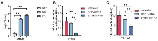 In A. mellifera, d11ds exhibited developmentally upregulated expression in worker MGs, with the transcript levels significantly increasing across caste transitions (Figure 5A, see Table S5). To validate its role in 10-HDA metabolism, we performed RNAi-mediated knockdown targeting d11ds. Compared with the untreated controls and GFP dsRNA-injected groups, the d11ds transcript levels decreased by 68.2%; see Table S13 (p < 0.01, t-test), in the dsRNA-treated MGs (Figure 5B). HPLC quantification revealed corresponding reductions in 10-HDA content: knockdown samples retained 45.6% of the untreated control levels and 56.5% of the GFP dsRNA-injected levels; see Table S14 (Figure 5C). These results confirm d11ds as a critical regulator of 10-HDA biosynthesis in worker bee MGs.