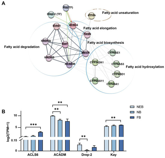 The PPI network of the 10-HDA related genes and the differently expressed transcription factors between NEBs vs. NBs and NEBs vs. FBs in A. mellifera. (A) PPI network of the 10-HDA related genes and the differently expressed transcription factors between NEBs, NBs, and FBs (see Table 2) was constructed using STRING tools. Transcription factors (TFs) are represented by “(TF)”, while the remaining proteins are indicated by spherical nodes. Line thickness (gray scale) represents the interaction strength. Regulatory relationships are categorized as follows: red lines denote activation, green solid lines indicate inhibition, and dashed lines suggest potential regulatory associations. Enrichment results of KEGG are indicated by circles. (B) The expression level of Kay and Drep-2 coding genes and their target genes related to 10-HDA biosynthesis identified by RNA-Seq. The mean of three biological replicates was plotted with error bars representing SEM. Statistical significance was determined by the two-tailed unpaired Student’s t-test. ** and *** indicate statistical significance at p < 0.01 and p < 0.001, respectively.