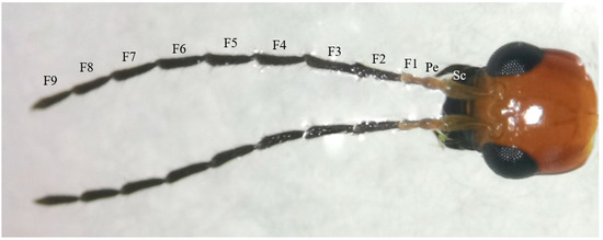 Figure 1. Morphology of the head of M. signata. F1–F9: flagellomere 1–9; Pe: pedicel; Sc: scape.