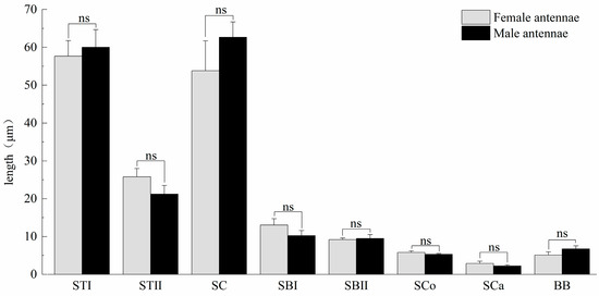 Figure 3. Length of antennal sensilla of M. signata. BB, Böhm bristles; SBI, sensilla basiconica I; SBII, sensilla basiconica II; SC, sensilla chaetica; SCa, sensilla auricillica; SCo, sensilla Coeloconica; STI, sensilla trichodea I; ST II, sensilla trichodea II. ns means no significant difference (p > 0.05).