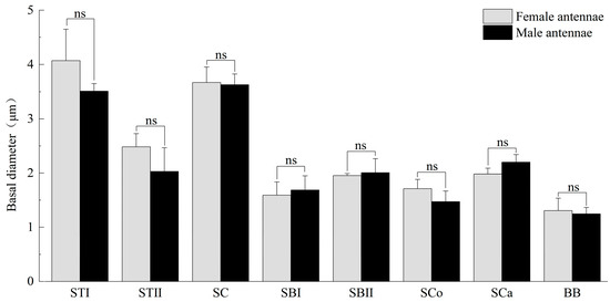 Figure 4. Basal diameter of antennal sensilla of M. signata. STI, sensilla trichodea I; ST II, sensilla trichodea II; SC, sensilla chaetica; SBI, sensilla basiconica I; SBII, sensilla basiconica II; SCo, sensilla Coeloconica; SCa, sensilla auricillica; BB, Böhm bristles. ns means no significant difference (p > 0.05).