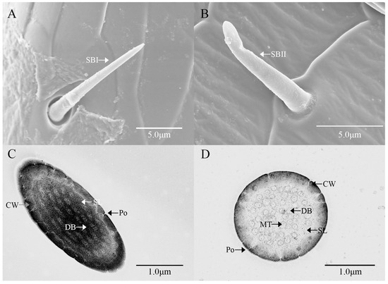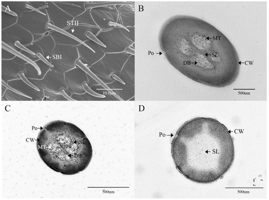 Figure 6. Ultrastructure of sensilla basiconca on the antennae of M. signata. (A,B) External morphology of sensilla basiconca I and II; (C) oblique section of sensilla basiconca I; (D) cross-section of sensilla basiconca I. CW: cuticular wall; DB: dendritic branches; MT: microtubules; Po: pore; SL: lymph space.