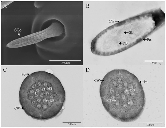 Sensilla coeloconica (SCo) exhibit an overall shape similar to SBII, but they are half the length of SBII. The sensillum resembles a flower bud and is located in a pit that protrudes from the surface of the antennae. The bottom wall of the sensilla features a vertical groove (Figure 7A). Transverse sections observed under transmission electron microscopy revealed a thin single wall of the sensillum with distinct pores and 14–17 branches within the lymphatic cavity, each containing a single microtubule (Figure 7B–D). The female SCo measure 5.79 ± 0.39 μm in length and 1.71 ± 0.17 μm in basal diameter, while the male SCo measure 5.28 ± 0.24 μm in length and 1.48 ± 0.19 μm in basal diameter (Figure 3 and Figure 4).